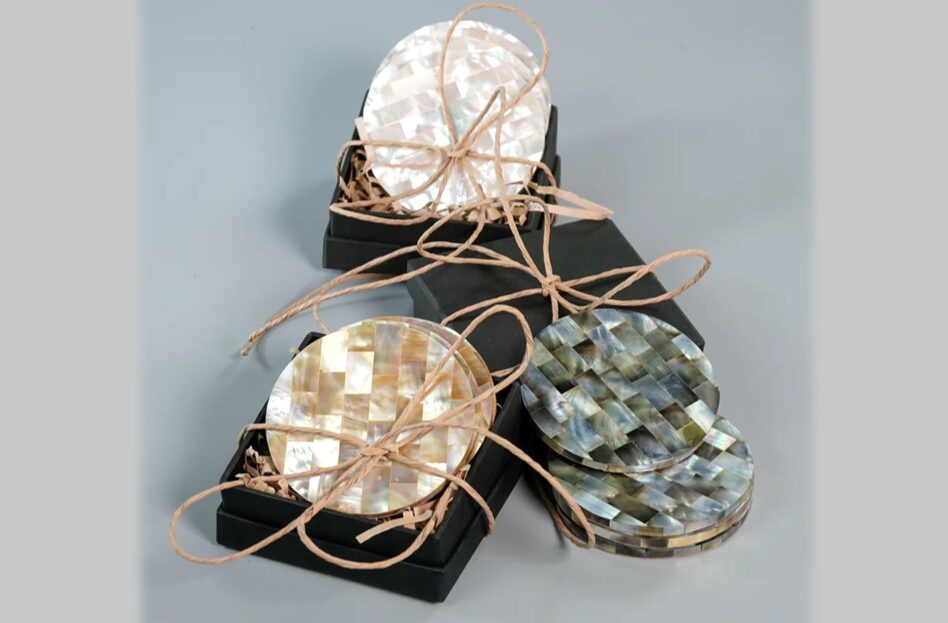 パールシェルを貼り合わせて作ったラウンドタイプのコースター